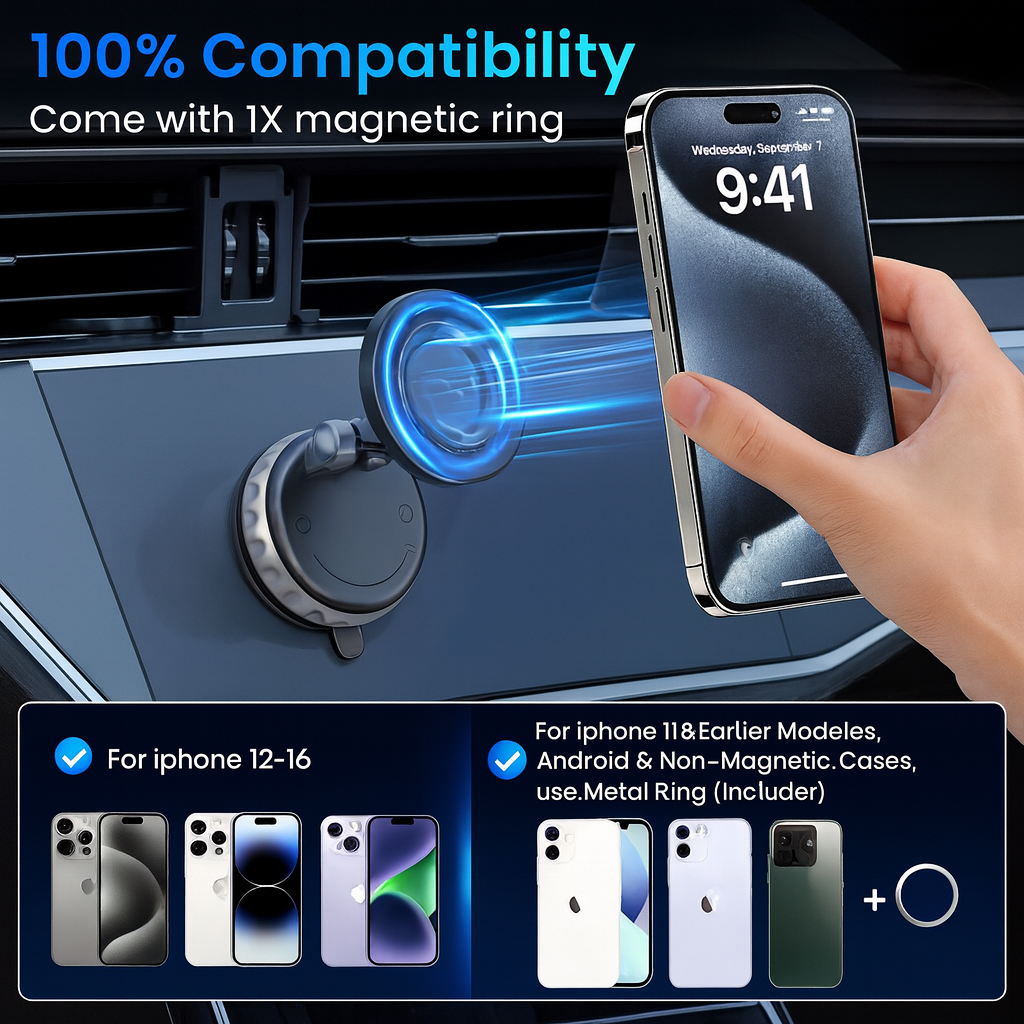 Experience 100% compatibility with all your devices — from iPhone 12 to 16, and even Android phones using the included magnetic ring. One mount, endless possibilities.