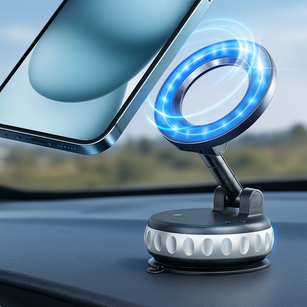 Crafted from premium aluminum alloy, this foldable magnetic phone mount offers 360° rotation and powerful vacuum stability — keeping your device secure and your drive seamless.